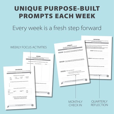 Our unique Compass Journal System structures your entire year into four meaningful quarters. Each quarter focuses on a core direction that supports your self improvement journey with purpose.